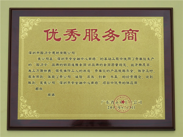 我公司在“深圳平安金融中心南塔”的基礎工程中使用了貴單位生產(chǎn)的固力士品牌直螺紋鋼筋連接套筒。該品牌的直螺紋鋼筋連接套筒質(zhì)量穩定,絲牙精度高,施工方便快捷,很受操作人人的歡迎。貴單位的產(chǎn)品規格齊全,供貨及時(shí),服務(wù)周到,體現了貴公司一切為客戶(hù)服務(wù)的經(jīng)營(yíng)理念,是我公司深圳平安金融中心南塔項目中優(yōu)秀的直螺紋鋼筋連接套筒供應商。