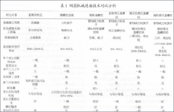 目前國內常見(jiàn)的幾種鋼筋機械連接技術(shù)的對比分析如表 1 所示。
