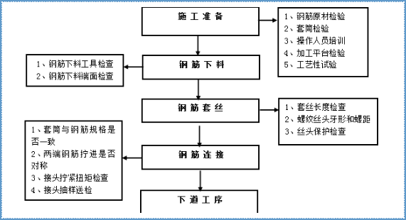 說(shuō)明:本流程圖反映的是一個(gè)合格的鋼筋直螺紋套筒連接施工工藝。如果某道工序經(jīng)自檢不合格,不能進(jìn)行下道工序施工。