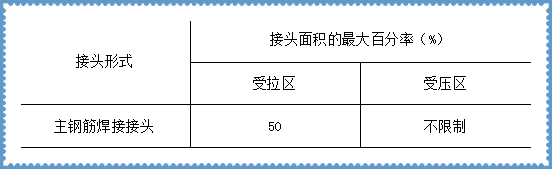 3.2 受力鋼筋的連接街頭應設置在內力較小處,并應錯開(kāi)布置。對焊接接頭和機械連接接頭,在接頭長(cháng)度區段內,同一根鋼筋不得有兩個(gè)接頭。配置在接頭長(cháng)度區段內的受力鋼筋,其接頭的截面面積占總截面面積的百分率,應符合表1的規定。
