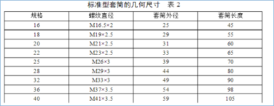 剝肋滾絲頭加工尺寸應符合表1的規定。絲頭加工長(cháng)度為標準型套筒長(cháng)度的1/2,其公差為+2P(P為螺距)。