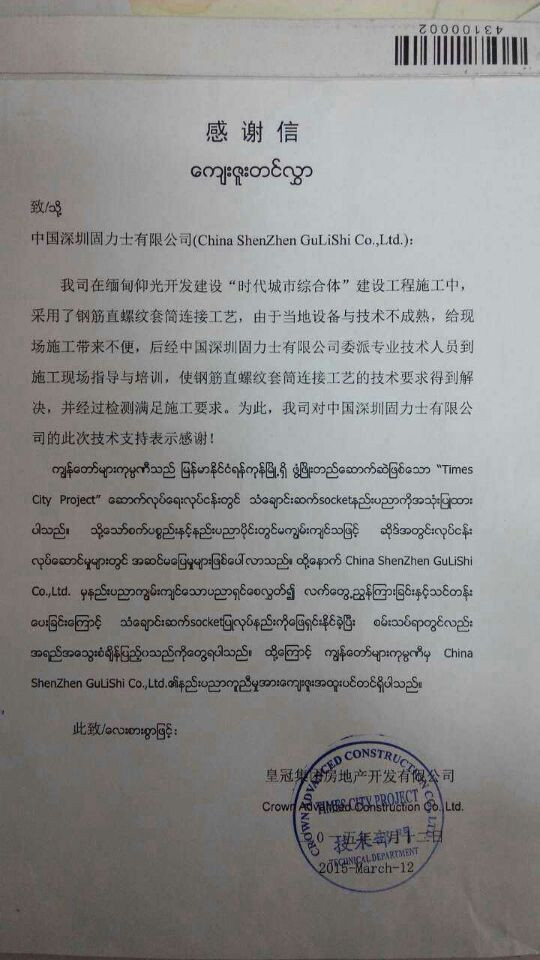 緬甸仰光在開(kāi)發(fā)建設“時(shí)代城市綜合體”建設工程施工中,采用了鋼筋直螺紋套筒連接工藝,由于當地設備與技術(shù)不成熟,給現場(chǎng)施工帶來(lái)不便。