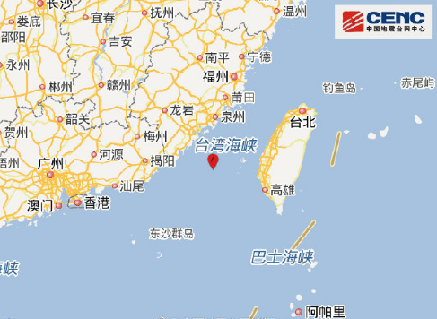中國地震臺網(wǎng)正式測定:11月26日07時(shí)57分在臺灣海峽(北緯23.28度,東經(jīng)118.60度)發(fā)生6.2級地震,震源深度20千米。